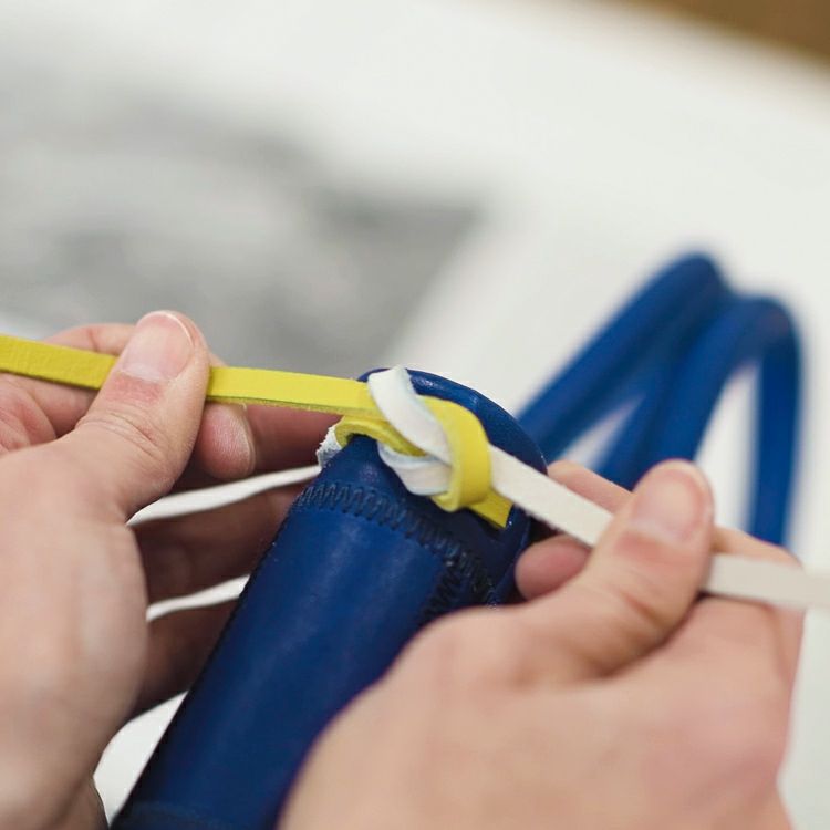4. 革レースをバッグの中央から両端に向かって穴に通して、両端をお好きな形に結ぶ
