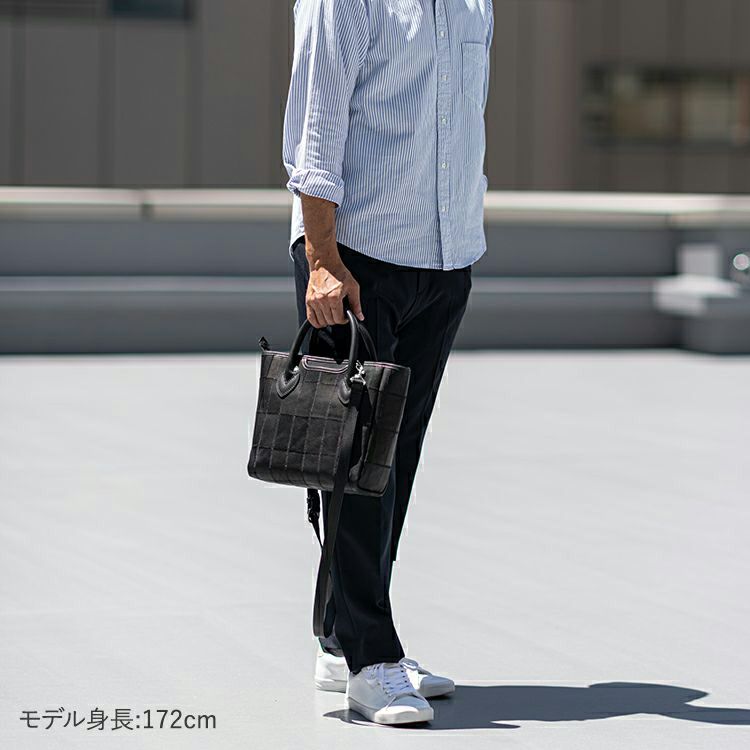 コンパクトなルックスながらマチが10cmあり、手回り品に加え、500mlのペットボトルもぴったり収まる、使いやすいサイズ感。開口部の天マチはジッパー付きで安心です。背面上部の外ポケットは、定期やスマホを入れておくのに便利。