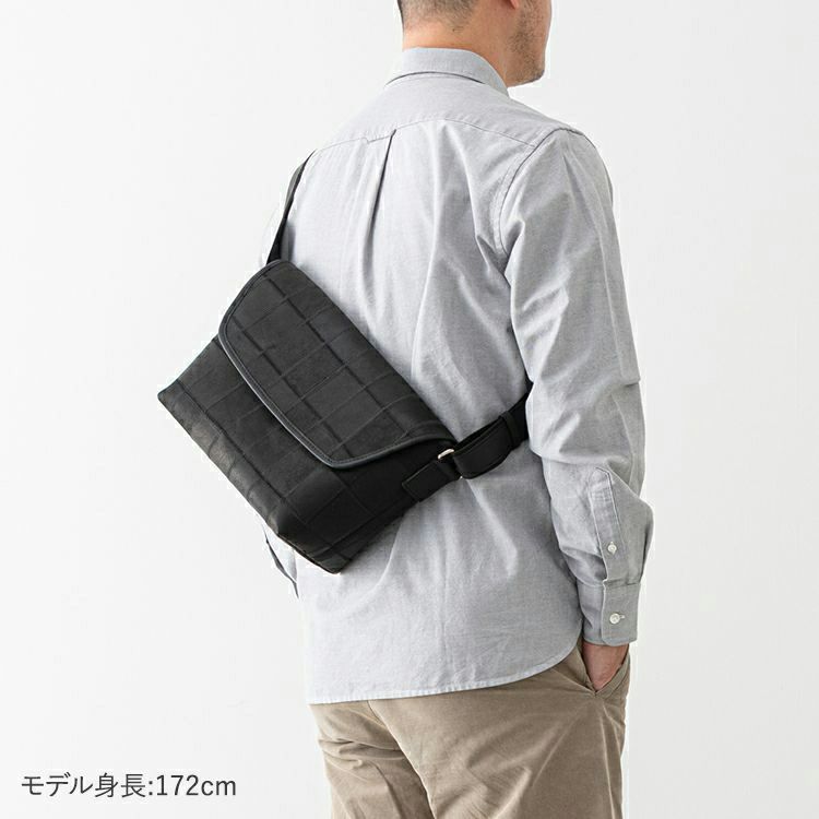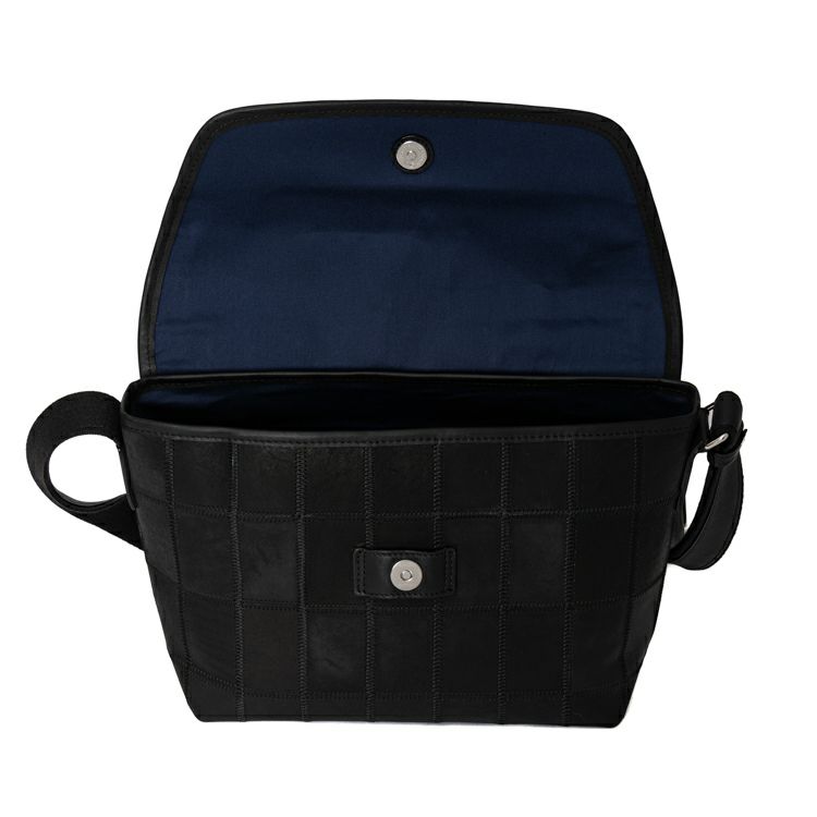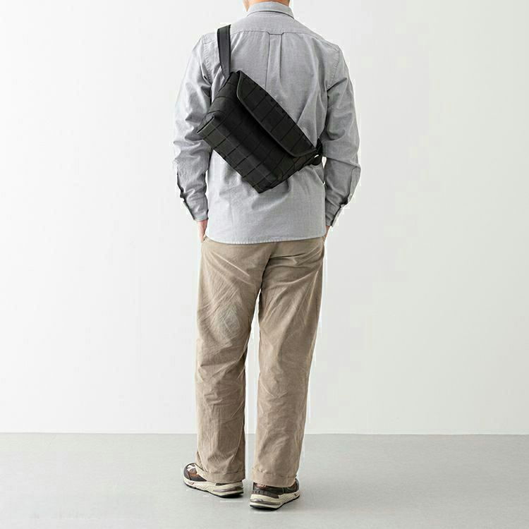 開口部はフラップタイプで、シンプルな動作での開けやすさが魅力。マグネットボタンで留める構造で、ボタンを少し立体的に留めることでフラップが少し浮いたような構造になり、開ける際に指に引っかかり、開けやすくしました。ショルダーストラップ裏面はコットン素材で、肌当たりを良くしました。