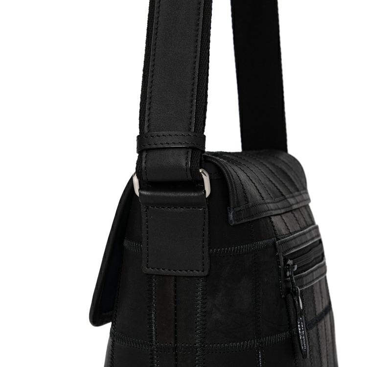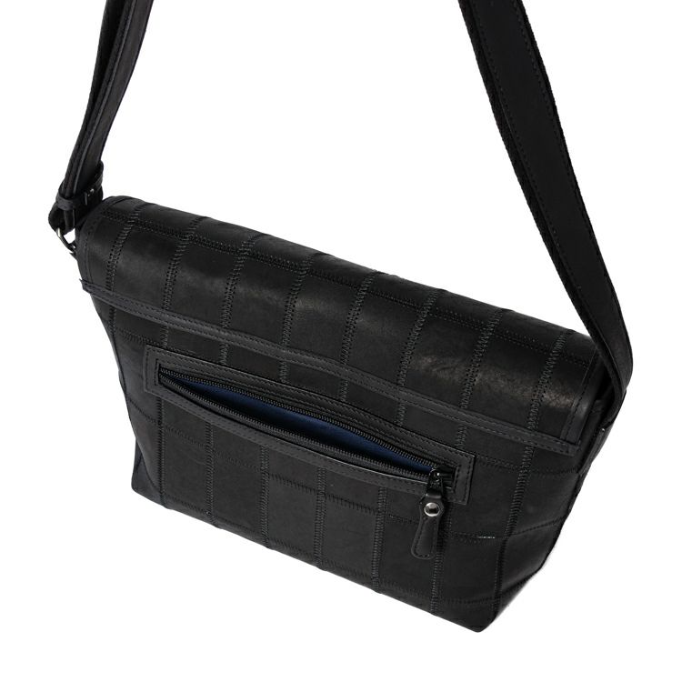 シックな色合いながらパッチワークの個性的なデザインが効いた、たっぷりとした収納力が魅力のレザーショルダーバッグ。普段使いはもちろん日帰り旅行などにも使えて便利。