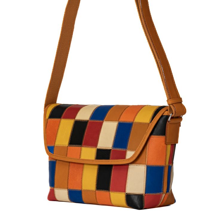 華やかなマルチカラーの色合いとパッチワークの個性的なデザインで、たっぷりとした収納力が魅力のレザーショルダーバッグ。普段使いはもちろん日帰り旅行などにも使えて便利。