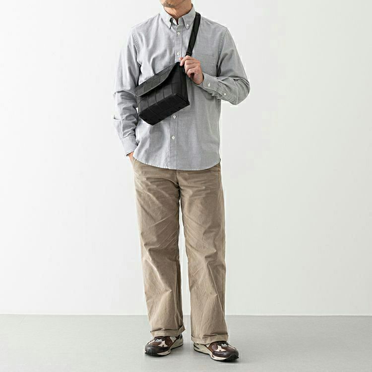 開口部はフラップタイプで、シンプルな動作での開けやすさが魅力。マグネットボタンで留める構造で、ボタンを少し立体的に留めることでフラップが少し浮いたような構造になり、開ける際に指に引っかかり、開けやすくしました。ショルダーストラップ裏面はコットン素材で、肌当たりを良くしました。
