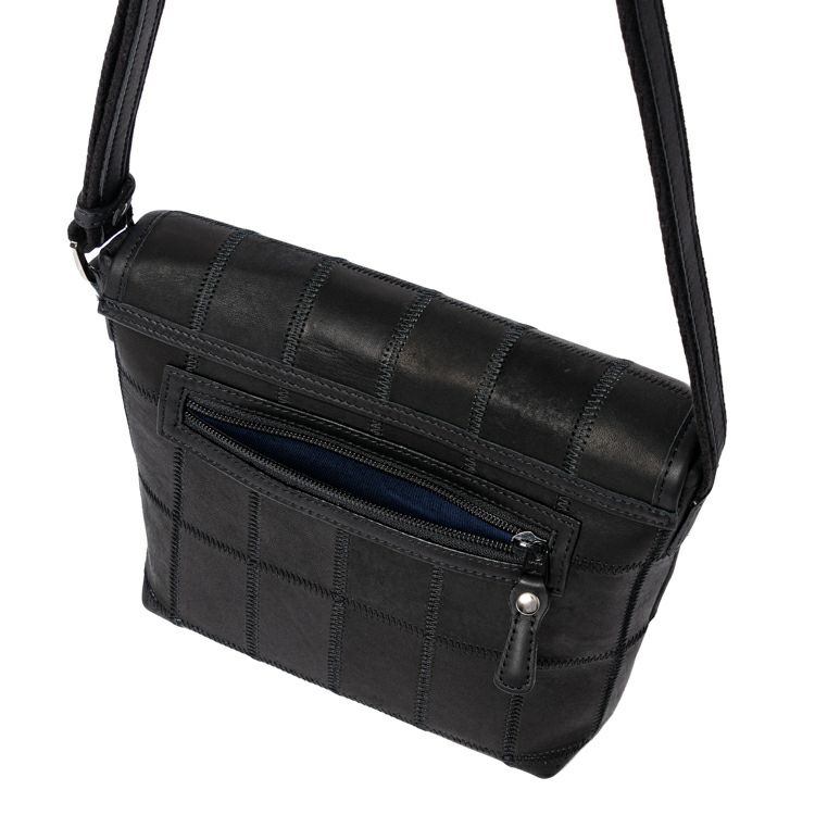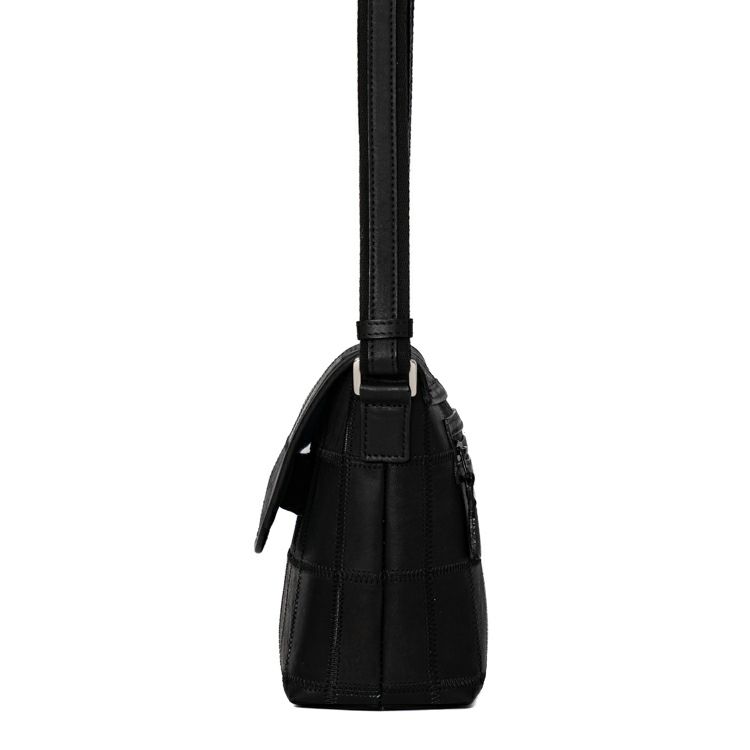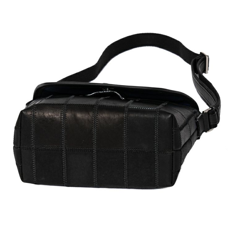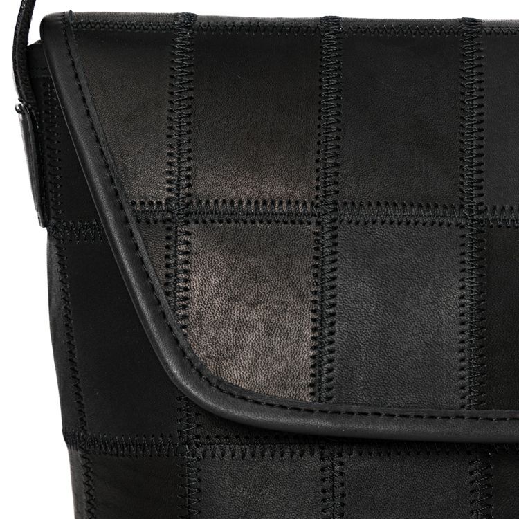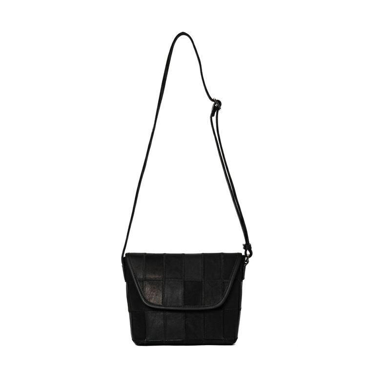 シックな色合いながらパッチワークの個性的なデザインがピリッと効いた、普段使いにちょうどいい小さめレザーショルダーバッグ。