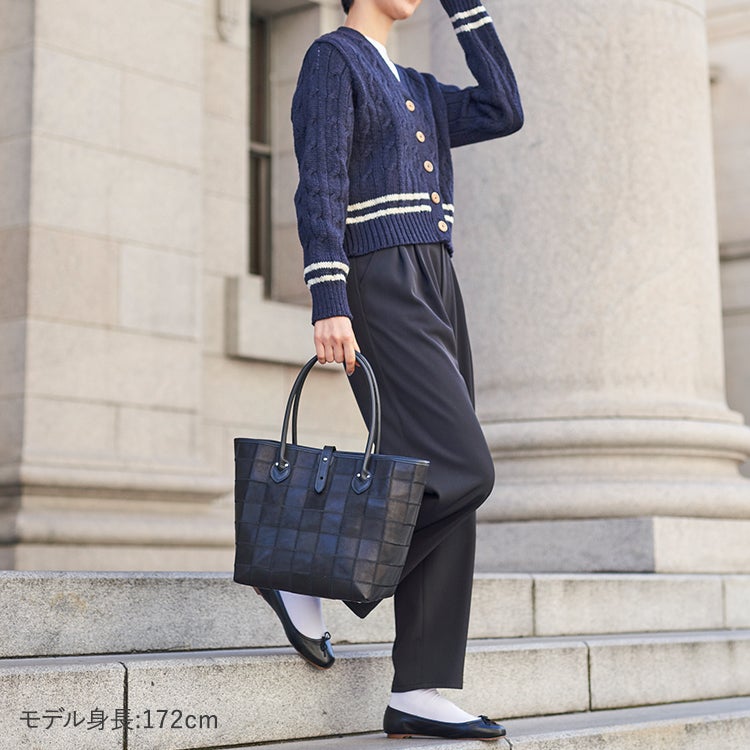 長財布やポーチ、スマートフォン、手帳などがしっかり収まり、必要なものをすっきり持ち運べるミディアムサイズの本革トート。
