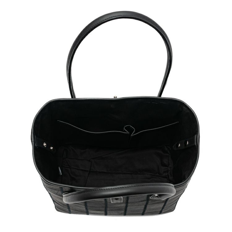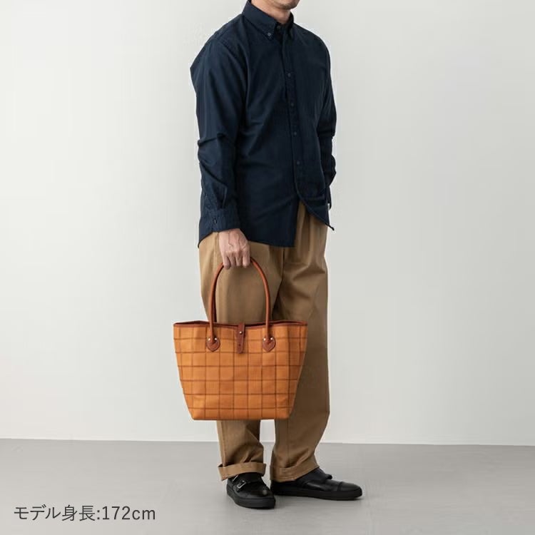 開口部は、クラシカルなギボシ金具で留める仕様。荷物の飛び出しを防ぎながら、アクセントとしても上品な存在感を添えます。