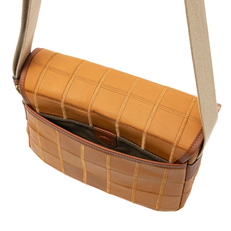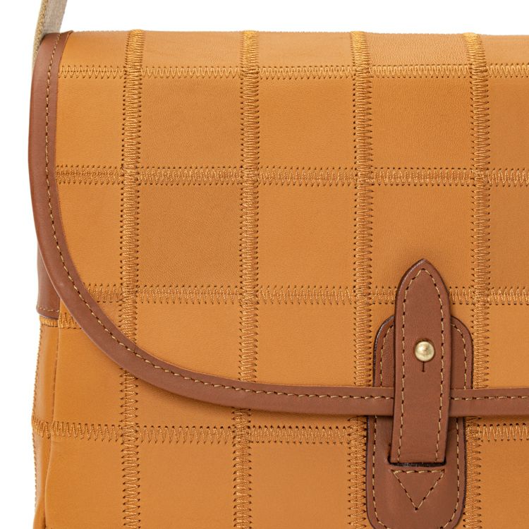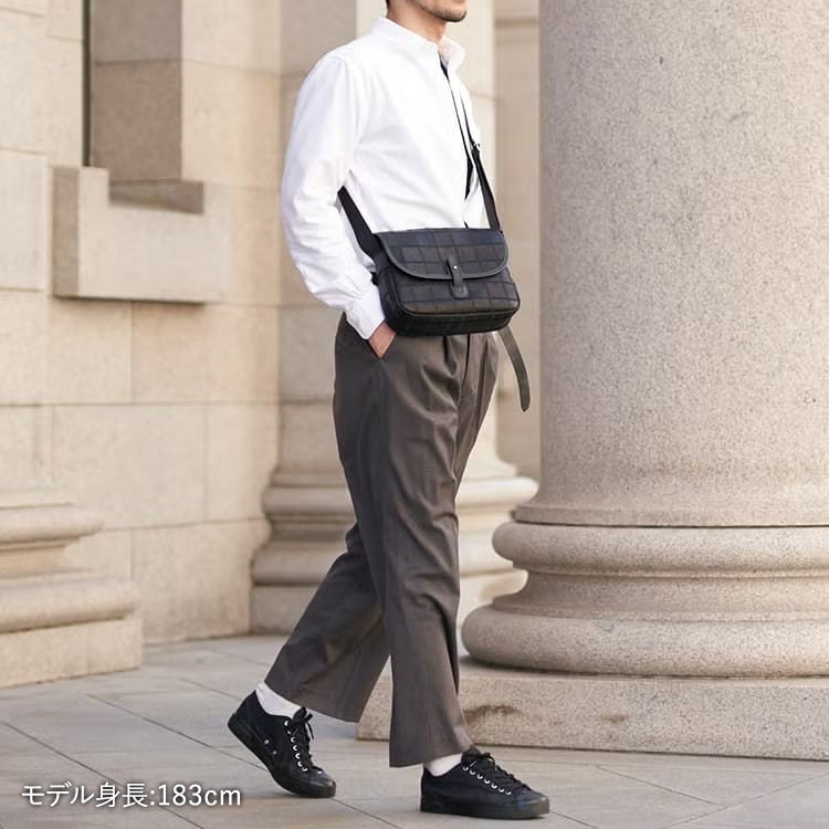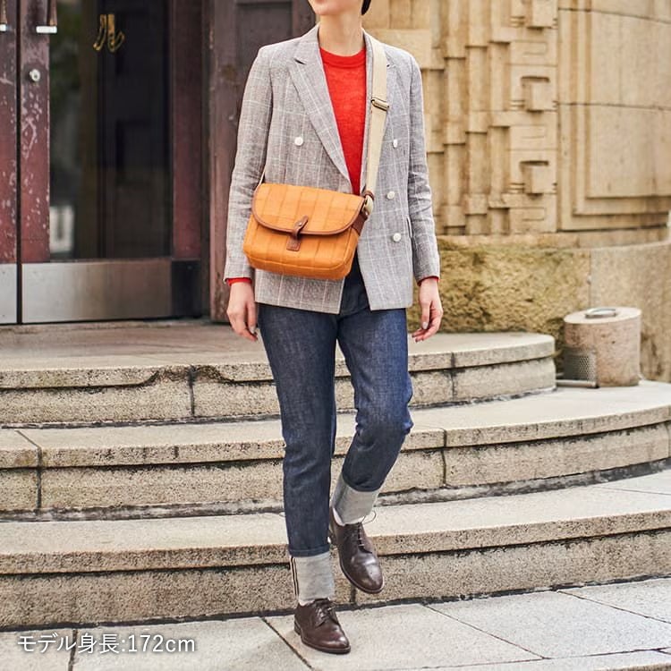 どこか懐かしさを感じるフラップ型のフォルムに、革の質感とニュアンスが重なる佇まい。