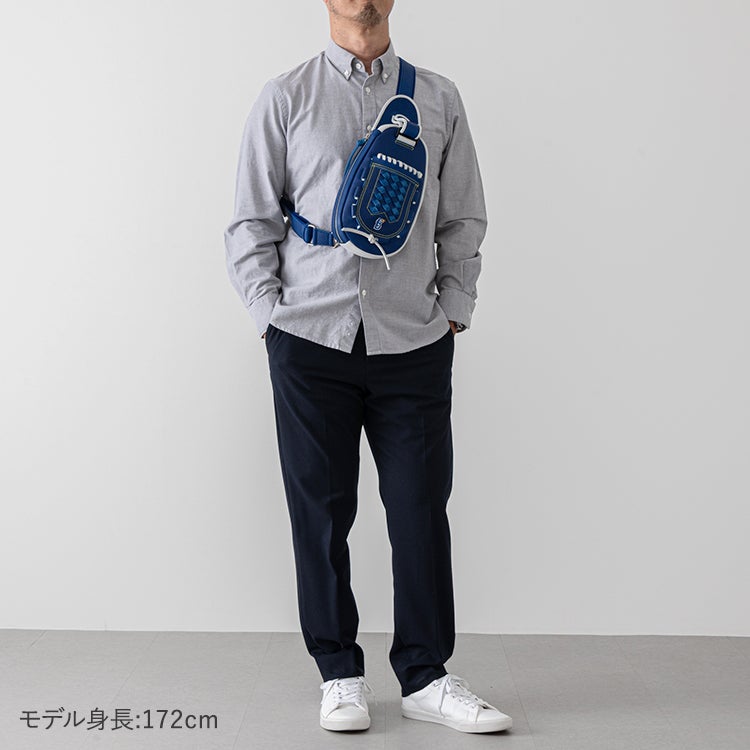 横浜DeNAベイスターズのチームカラーである青と白を基調に仕立てた、特別仕様のグローブボディバッグ。