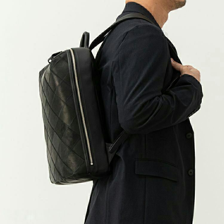 スムースレザーの滑らかさに、繊細なダイヤ柄のパネルが印象的なレザーバックパック。