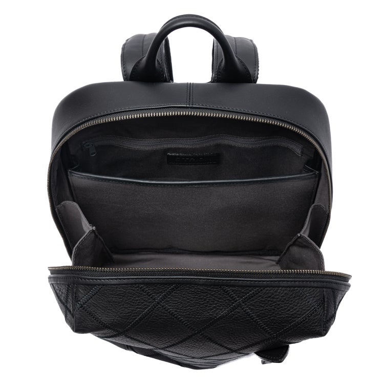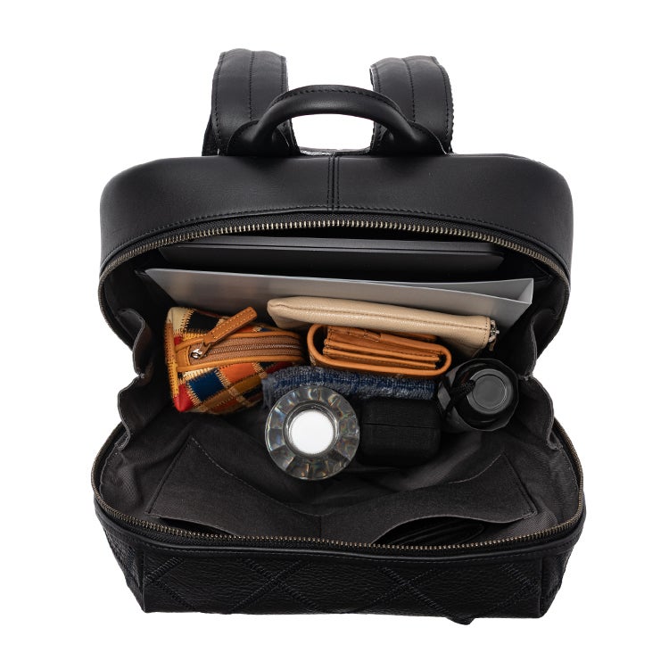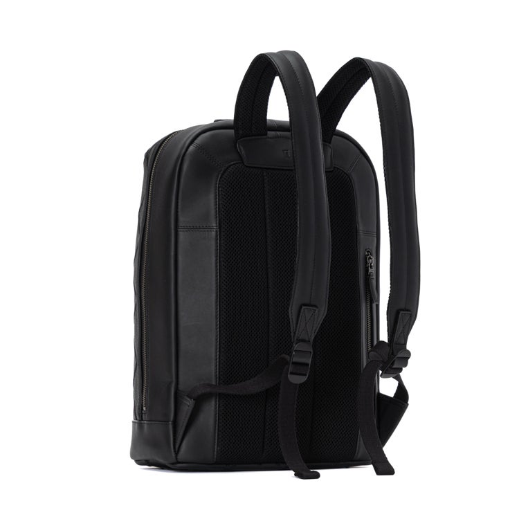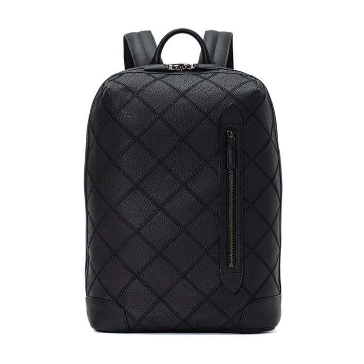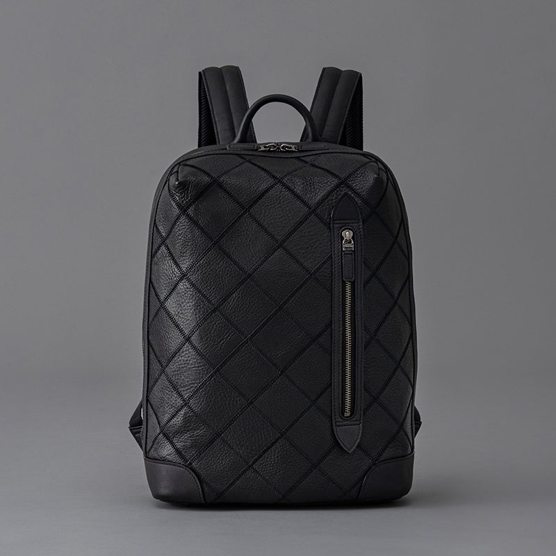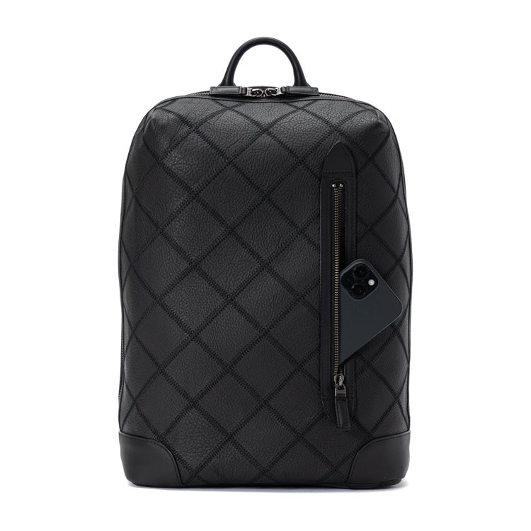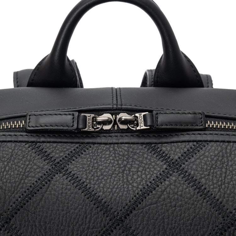 ダイヤ柄のステッチ模様が、すっきりとしたシボ革のバックパックにリズムと個性を加えます。主張しすぎない、でも近くで見るとちゃんとTRIONらしい。毎日背負いたくなる、デザインのディテールです。