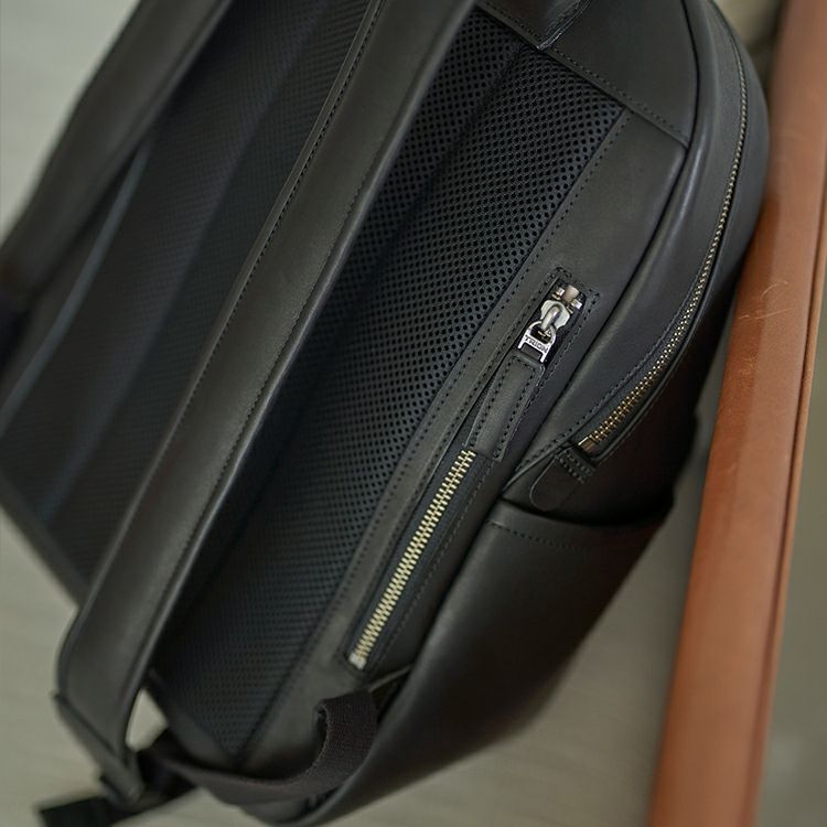 A4書類や仕事道具一式、休日にはお出かけアイテムがゆとりをもって収まる広めのマチとメインルーム。背面にはクッション材入りの専用ポケットを配置し、13インチPCやタブレットを収納可能。前面・サイド・背面の外ポケットで、頻繁に使う小物の出し入れもスムーズです。