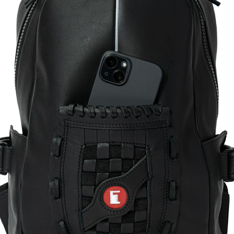 野球グローブに使われるグラブレザーを使用。丈夫な作りで触り心地や匂いもグローブそのもの。バッグ正面にグローブのウェブ部分をあしらったデザインは、オープンポケットとしてスマホやカードケースも収納できます。正面上部のホワイトラインは、野球グラブの指部分に用いられる「ハミダシ」と呼ばれる構造を採用。
