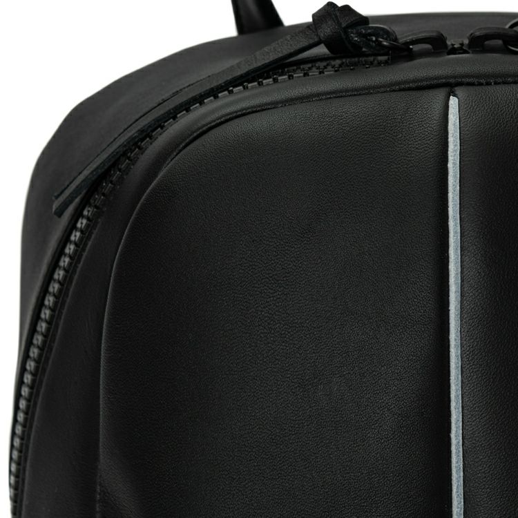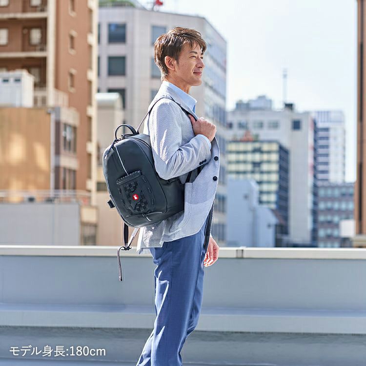 A4サイズはすっぽり収まるサイズ感。マチを最大約17cmと広めにとることで、旅行や出張など荷物の多いシーンでもお使いいただけます。また、オールブラックのシックな仕上がりで、カジュアルなビジネスシーンにもお使いいただけます。