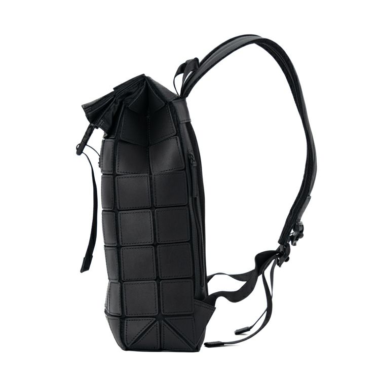開口部はロールトップ式で、荷物の量に合わせて調整可能。折り曲げやすいように、あえて折りたたむ側にはレザーパーツを貼らず、ナイロンのみで仕立てることで軽やかに折り畳めて、開閉もスムーズ。さらにサイドマチのトップ部分にはマグネットを仕込み、型崩れや不用意な広がりを防止。見た目の美しさと使い勝手の良さを両立させています。