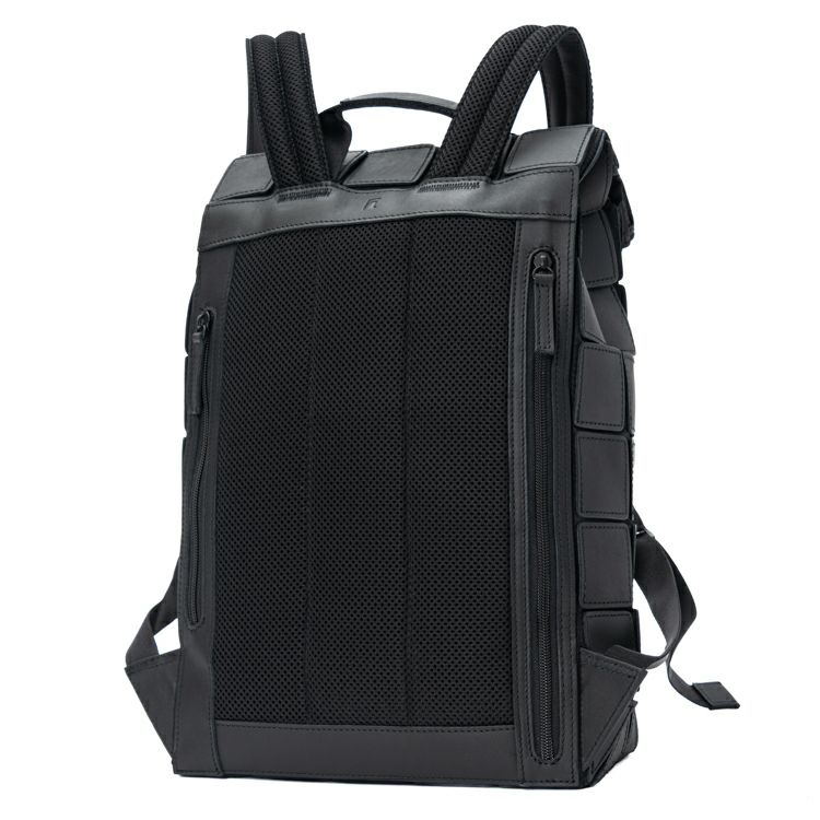 背面左側のジッパーを開ければ、ロールトップを開けずとも直接メイン収納へアクセス可能。右側のジッパーポケットは、スマホやパスケースなどの小物用。背面はメッシュ仕様で蒸れを軽減し、通勤通学でも快適に。