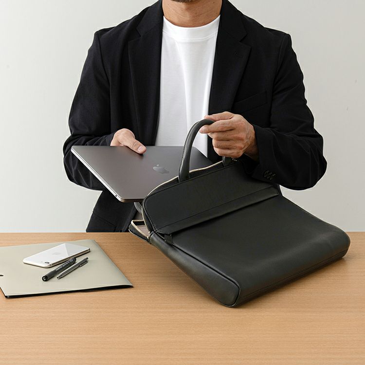 コンパクトでスッキリとしたフォルムに、必要十分な収納力を備えた薄マチブリーフケース。A4サイズや13インチのノートPCが無理なく収まり、日常のビジネスシーンにちょうどいいサイズ感です。