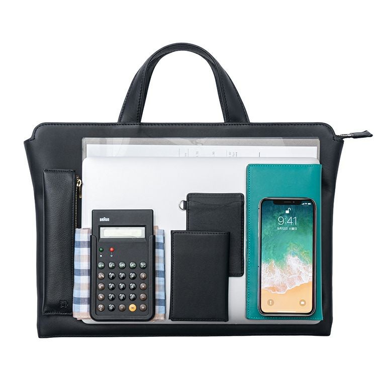 13インチノートPCやA4書類がすっきりと収まり、電卓やスマートフォン、カードケースなどの小物類も整理して収納いただけます。内装ポケットや仕切りを活かして、ビジネスツールを機能的に持ち運べるのも魅力のひとつです。出し入れのしやすさにも配慮して設計されているため、移動中や打ち合わせ前のちょっとした時間にもスマートに対応できます。