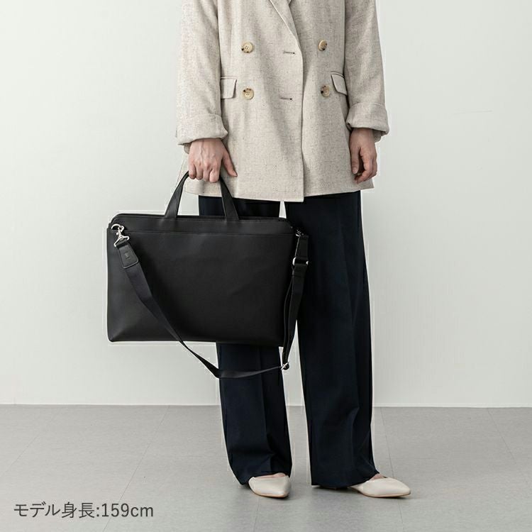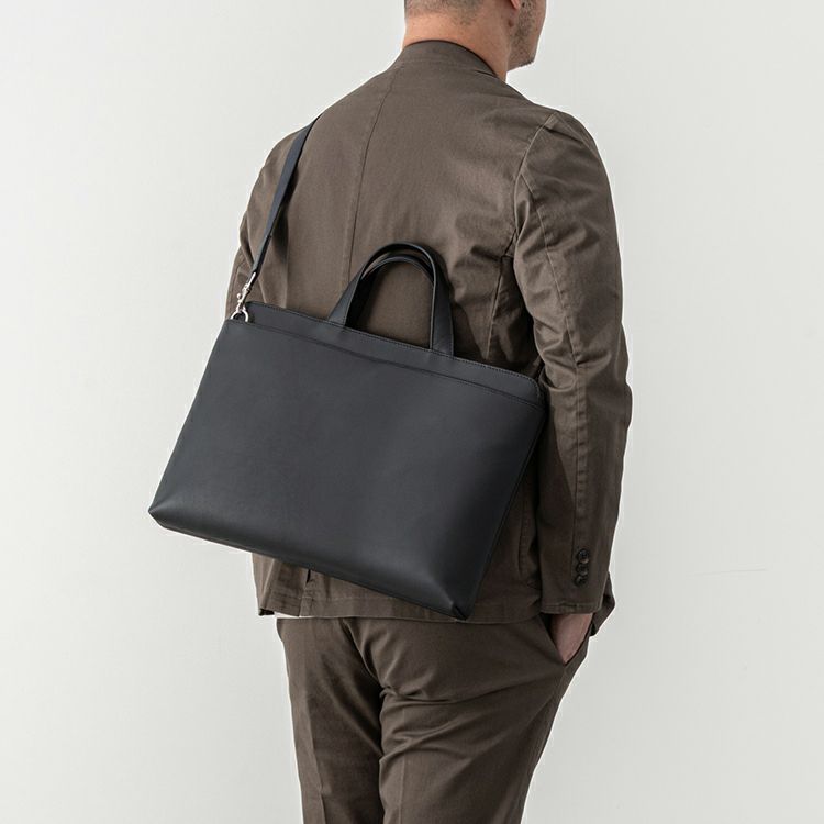 5cmのマチ幅を持たせたことで、13インチPCなどデバイス、A4書類、小物類までゆとりをもって収納可能に。さらに取り外し可能なショルダーベルト付きの2WAY仕様で、シーンやスタイルに合わせた持ち方が選べます。スマートな見た目はそのままに、日常使いの快適さをしっかりと備えたモデルです。