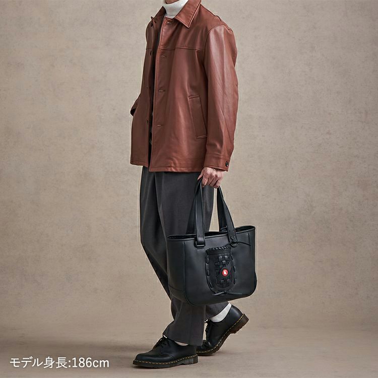 野球グローブに使われるグラブレザーを使用。丈夫な作りで触り心地や匂いもグローブそのもの。バッグ正面にグローブのウェブ部分をあしらったデザインは、オープンポケットとしてスマホやカードケースも収納できます。さらに、レース紐をあしらったハンドルなど、グローブモチーフを随所に散りばめました。オールブラックのシックな仕上がりで、カジュアルなビジネスシーンにもお使いいただけます。