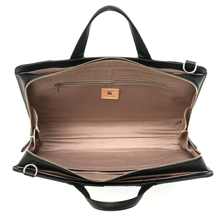 内部はA4書類も入る仕切りポケット、オープンポケット2つ、ジッパーポケット付きで小物類も整理しやすいつくり。