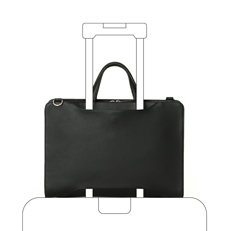 シンプルでミニマル、多機能ながらスマートな印象のビジネスバッグ。最大の特徴は、スーツケースのハンドルに通して固定できるセットアップ機能。手持ちで使用する際にも違和感がないよう、ベルトに見えないようなデザインと持つ人のスタイルを引き立てる上質なレザーにこだわりました。女性でも持ちやすいデザインです。