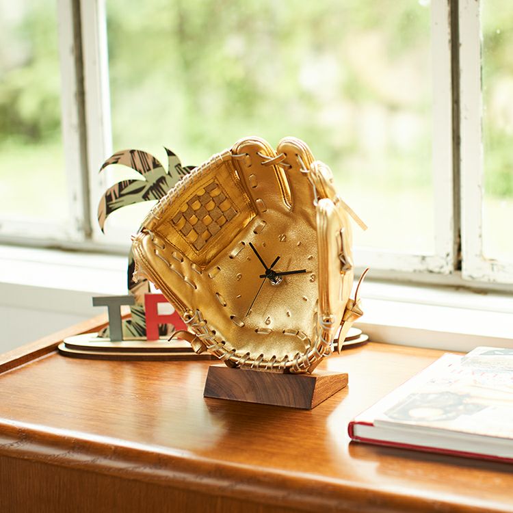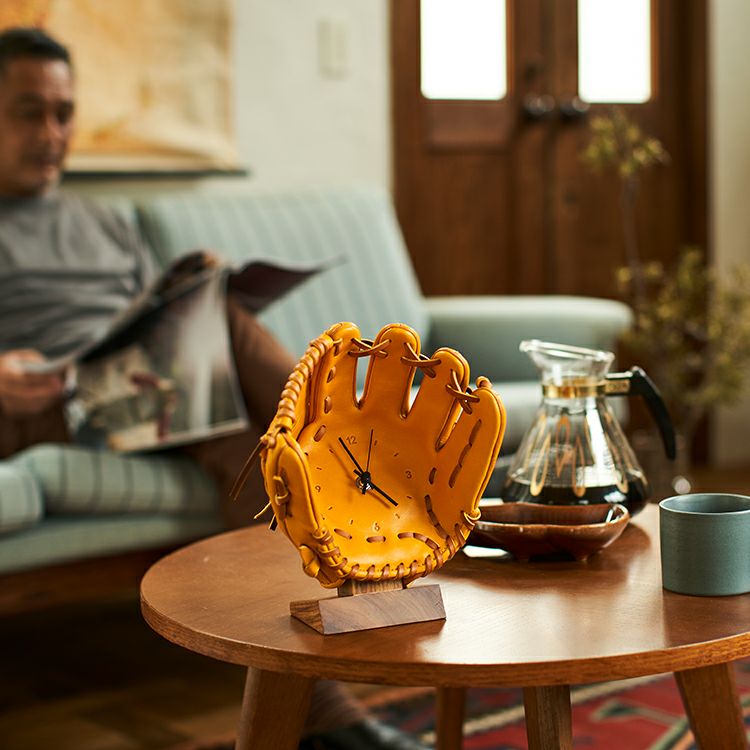そこで、付加価値としてグラブのポケット面に時計をつけた仕様を開発。生活に馴染むインテリアとしてグラブを生まれ変わらせました。