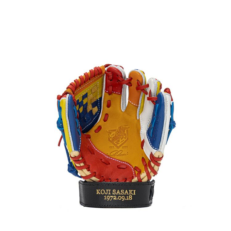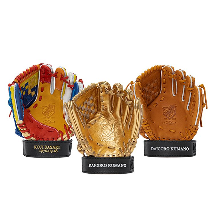 野球グローブの製法そのままに作られた本格派ミニチュアグラブに、台座刻印のカスタマイズを加えることで、心に残る記念品・贈り物へと昇華しました。あなたや大切な方の「名前」や「記念日」が入る特別仕様モデルです。