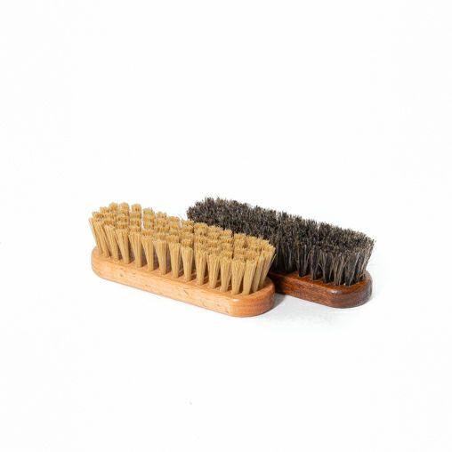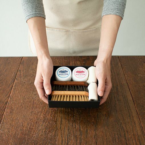 【使用方法】 1. ホースブラシでほこりを落とします。強く擦らずに、ブラシの毛の先で優しく払うようにブラッシングします。 2. クリームを少量取り、コットンによく馴染ませて、薄く塗り込みます。この時も強く擦らず、優しく撫でるようにします。塗り重ねたい場合も、「少量ずつ取って、コットンに馴染ませ、薄く塗る」工程を繰り返します。 3.ナイロンブラシでなじませます。毛先を面で当て、優しく撫でるようにブラッシングしましょう。