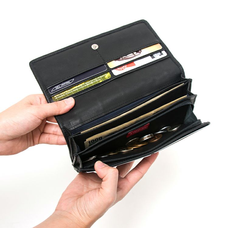フラップタイプのスタンダードなかたちで、収納力はしっかり確保。お札入れは、広めの2つとその間に薄いフリーポケットを1つ配置し、紙幣の種類ごとに分けたり、レシートなどを仕分けることができます。