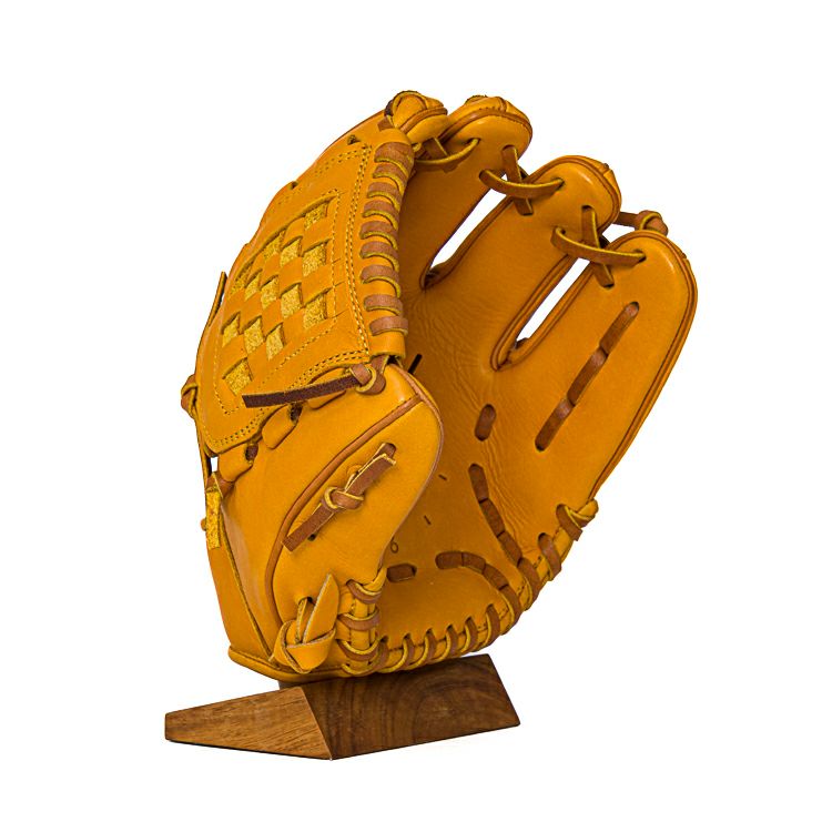 硬式用のオールラウンド型をベースに、インテリアとして飾りやすいよう、大きさを実際のグラブの83%に縮小。時計部分は文字盤が見やすいよう、指股や平トジの位置など修正し、ポケット面を広く見やすくしています。