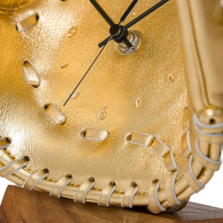 硬式用のオールラウンド型をベースに、インテリアとして飾りやすいよう、大きさを実際のグラブの83%に縮小。時計部分は文字盤が見やすいよう、指股や平トジの位置など修正し、ポケット面を広く見やすくしています。