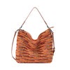 赤・オレンジ・イエローを中心に複雑に重なり合う、鮮やかな色の表情。タンレザーとの組み合わせが、華やかさの中に大人らしい落ち着きを添えます。見る角度や光の当たり方によって表情が変わり、同じものは世界にひとつとして存在しません。