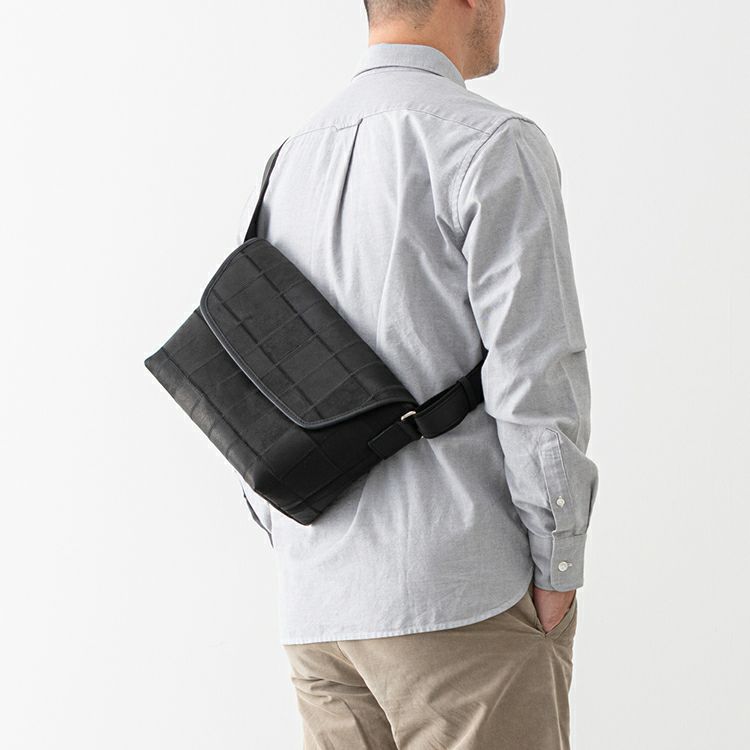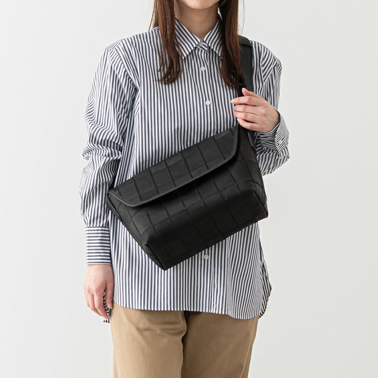 開口部はフラップタイプで、シンプルな動作での開けやすさが魅力。マグネットボタンで留める構造で、ボタンを少し立体的に留めることでフラップが少し浮いたような構造になり、開ける際に指に引っかかり、開けやすくしました。ショルダーストラップ裏面はコットン素材で、肌当たりを良くしました。