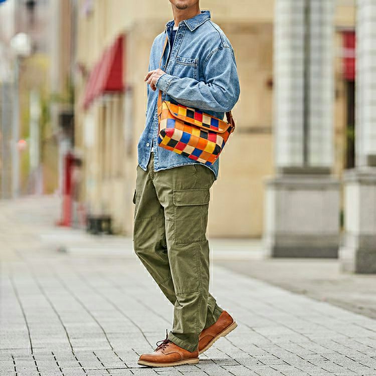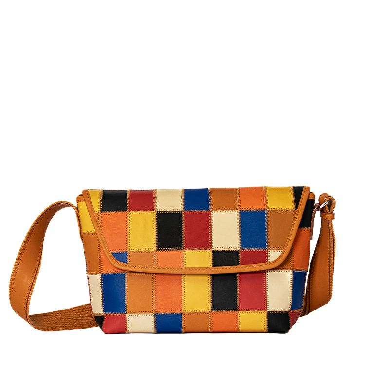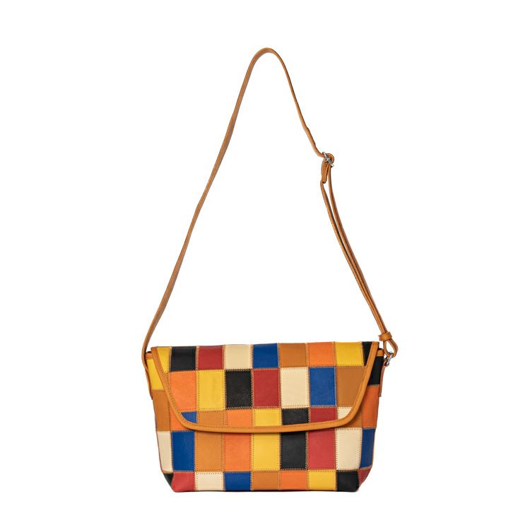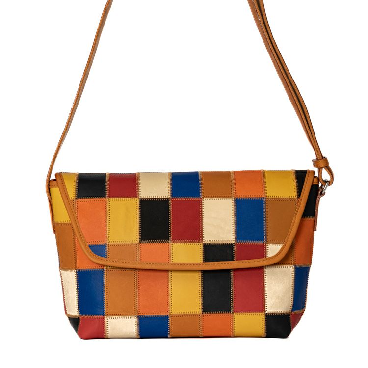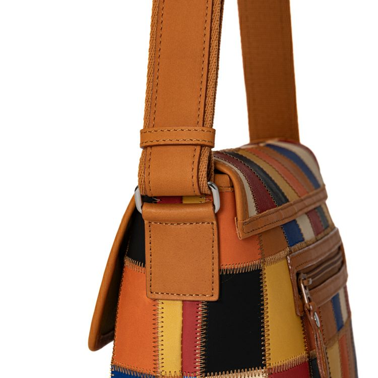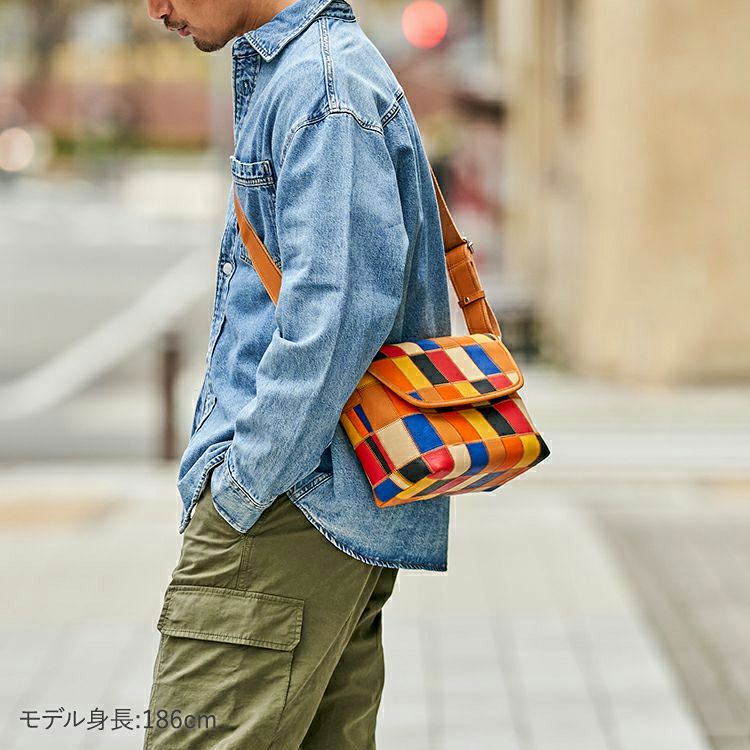 華やかなマルチカラーの色合いとパッチワークの個性的なデザインで、たっぷりとした収納力が魅力のレザーショルダーバッグ。普段使いはもちろん日帰り旅行などにも使えて便利。