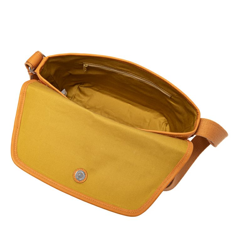 開口部はフラップタイプで、シンプルな動作での開けやすさが魅力。マグネットボタンで留める構造で、ボタンを少し立体的に留めることでフラップが少し浮いたような構造になり、開ける際に指に引っかかり、開けやすくしました。ショルダーストラップ裏面はコットン素材で、肌当たりを良くしました。