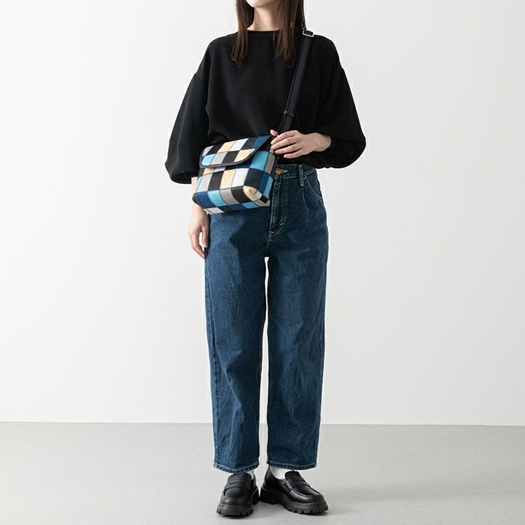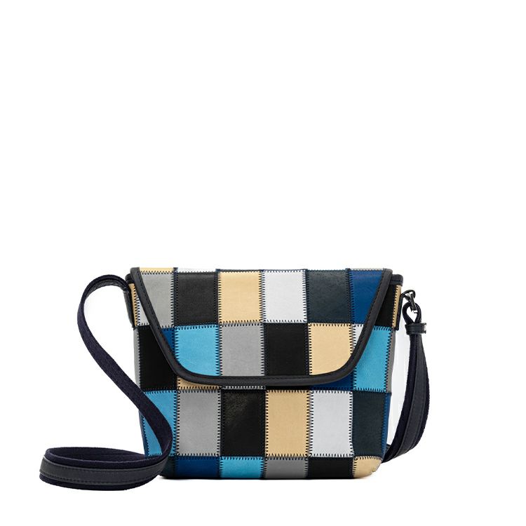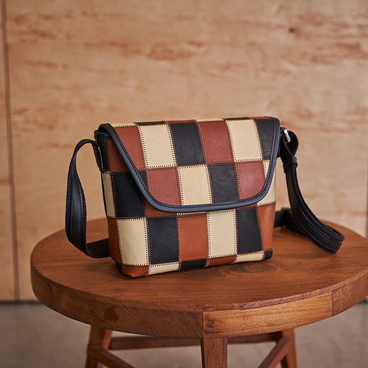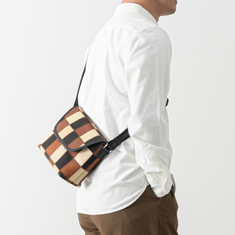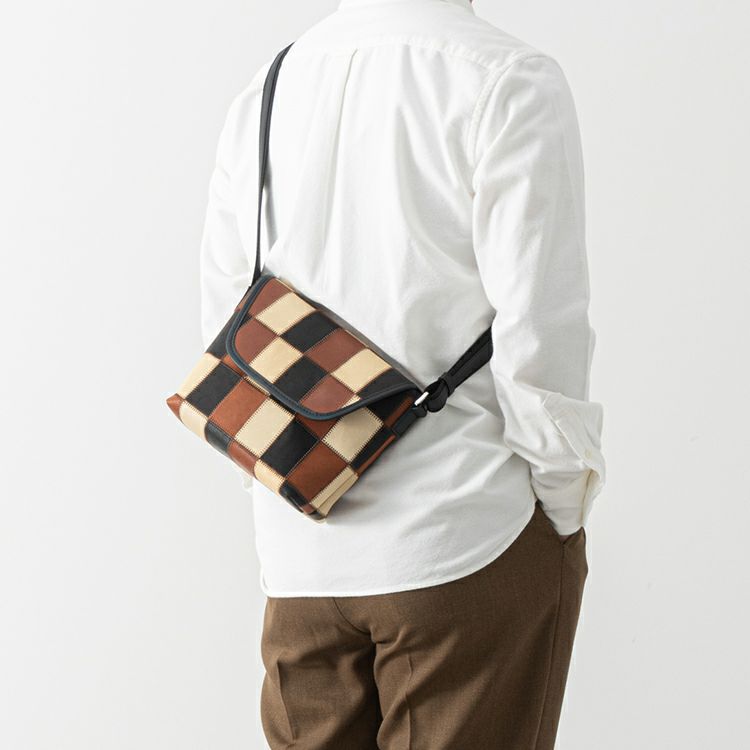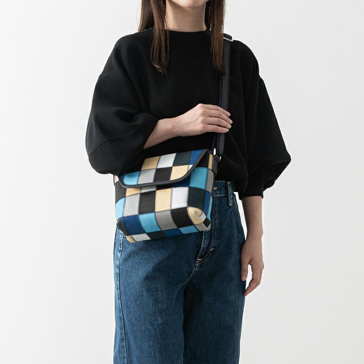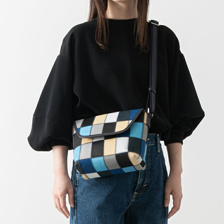 華やかなマルチカラーの色合いとパッチワークの個性的なデザインで、普段使いにちょうどいい小さめレザーショルダーバッグ。限定カラーとして温かみのある色合いのBrown check、新色としてBlue Multiが登場。