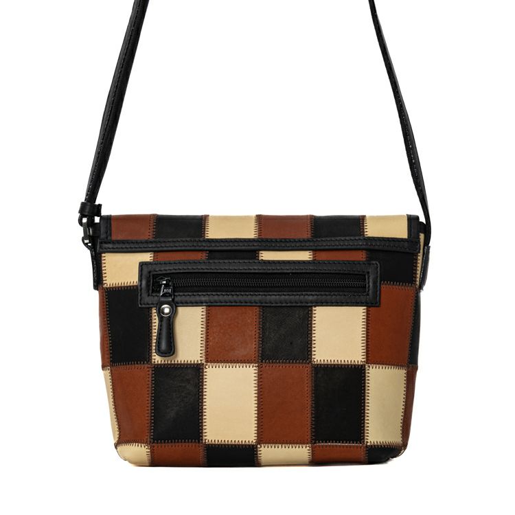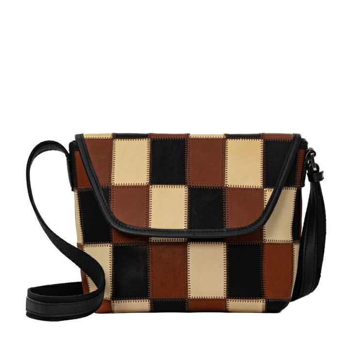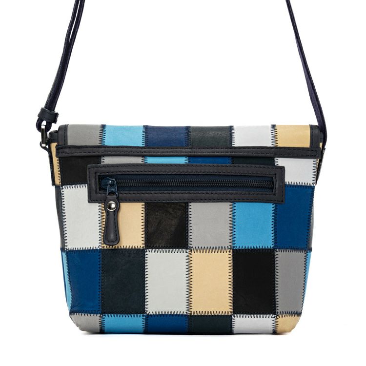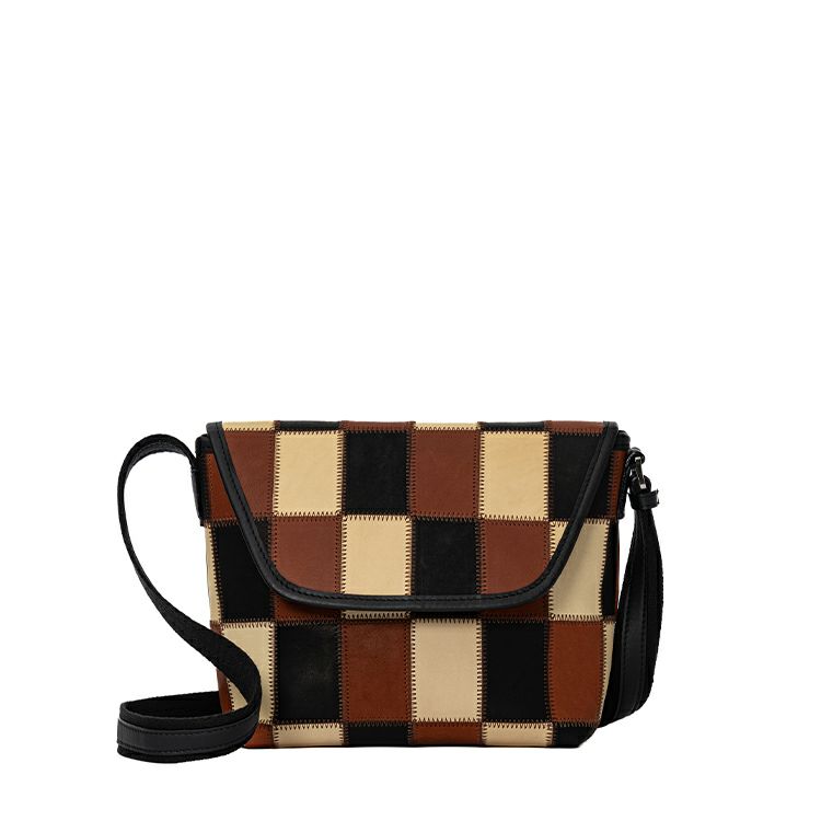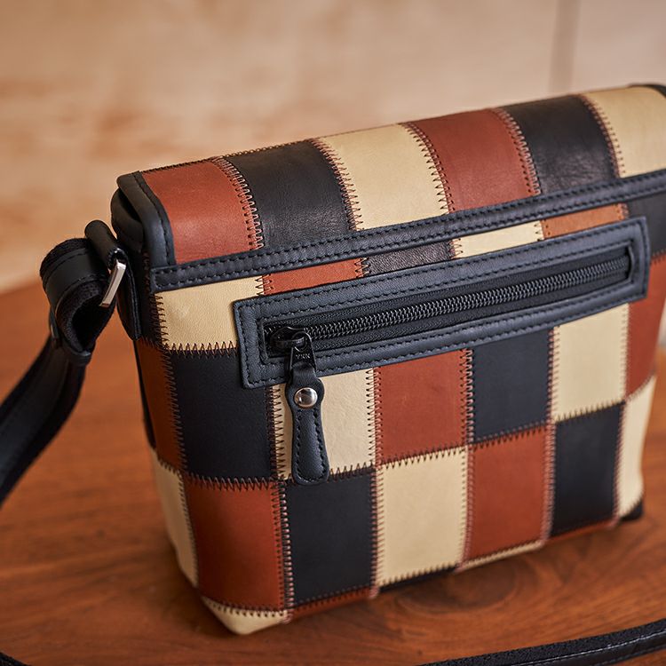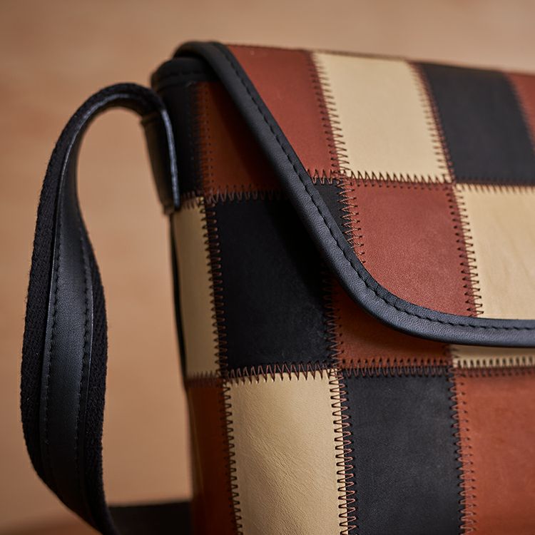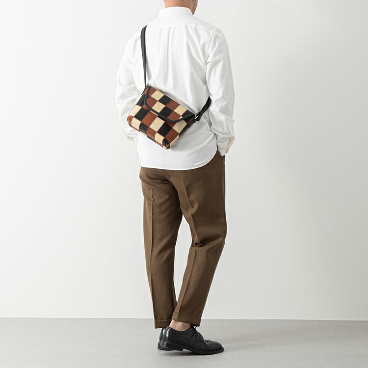華やかなマルチカラーの色合いとパッチワークの個性的なデザインで、普段使いにちょうどいい小さめレザーショルダーバッグ。限定カラーとして温かみのある色合いのBrown check、新色としてBlue Multiが登場。