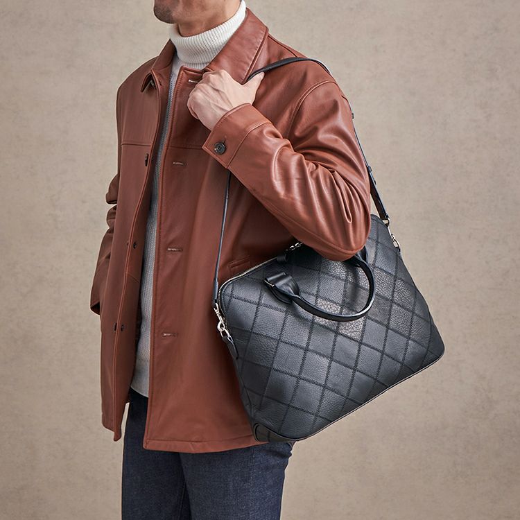 ボディ本体は凹凸のある表情の、肉厚で柔らかなタンブルレザーのパーツを1枚1枚丁寧に繋ぎ合わせ、それをダイヤ柄に配置することで、上品で優美さも感じる仕上がりに。ハンドルと取り外し可能な本革ショルダーストラップは肌当たりのいいスムースレザーを使用。
