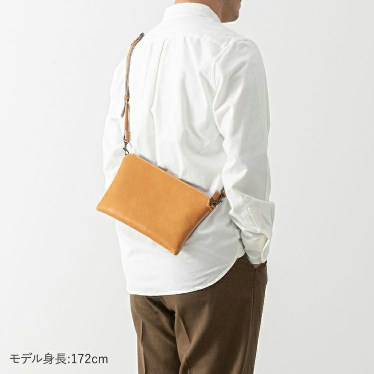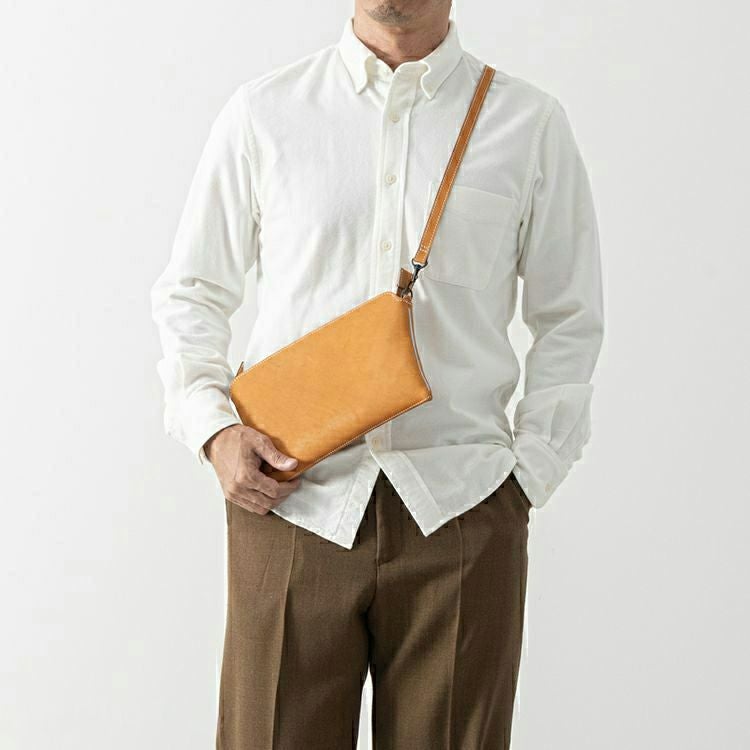 細めのショルダーストラップは取り外し可能で、クラッチやポーチとしても使える2WAY仕様。大きめのかばんに忍ばせてバックインバックに、旅先や出張先で貴重品用バッグとしてお使い頂くのもおすすめ。シンプルなフォルムと上質のレザー使いは、場所を選ばず色んなシーンで活躍します。