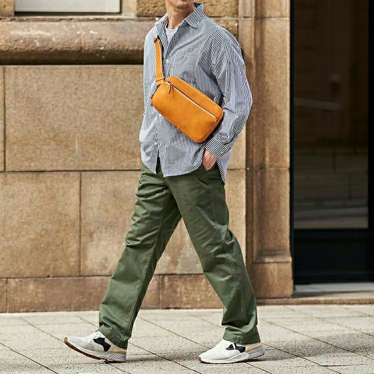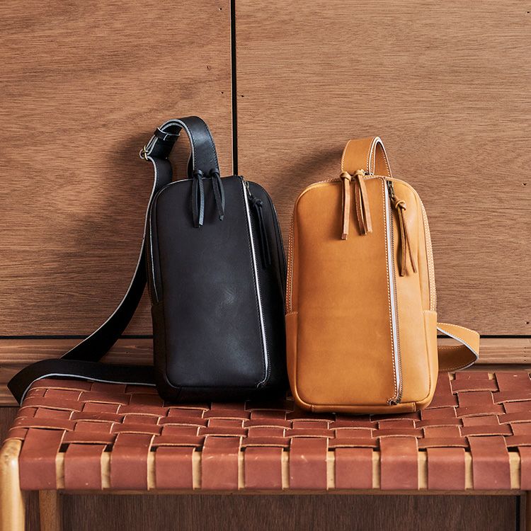 休日に相棒として使える程よい大きさと使い心地にこだわりました。長財布やポーチ類はもちろん、500mlのペットボトル、文庫本なども入ります。開口部はぐるりと大きく開く構造で、前面のジッパーポケットもスマホやカードを入れやすいサイズ感に。