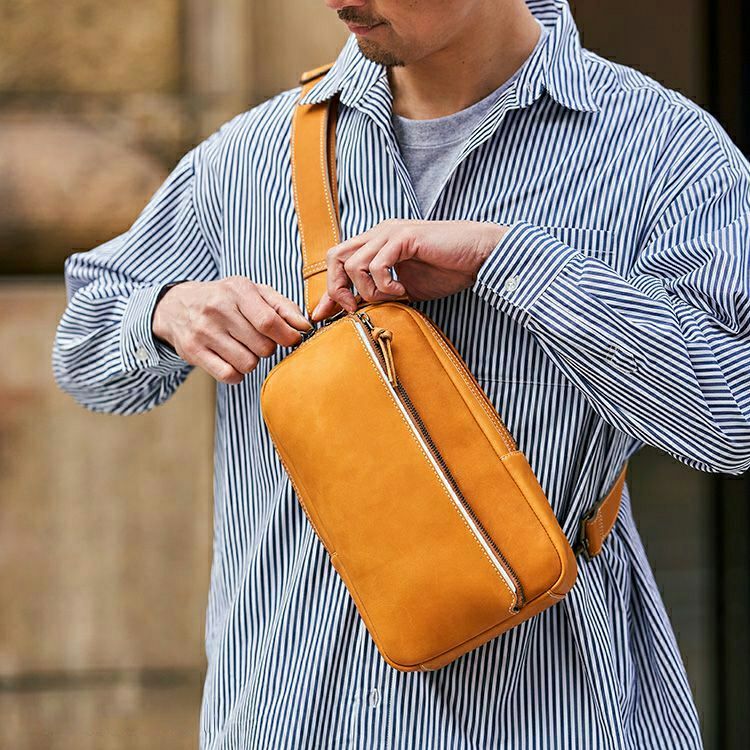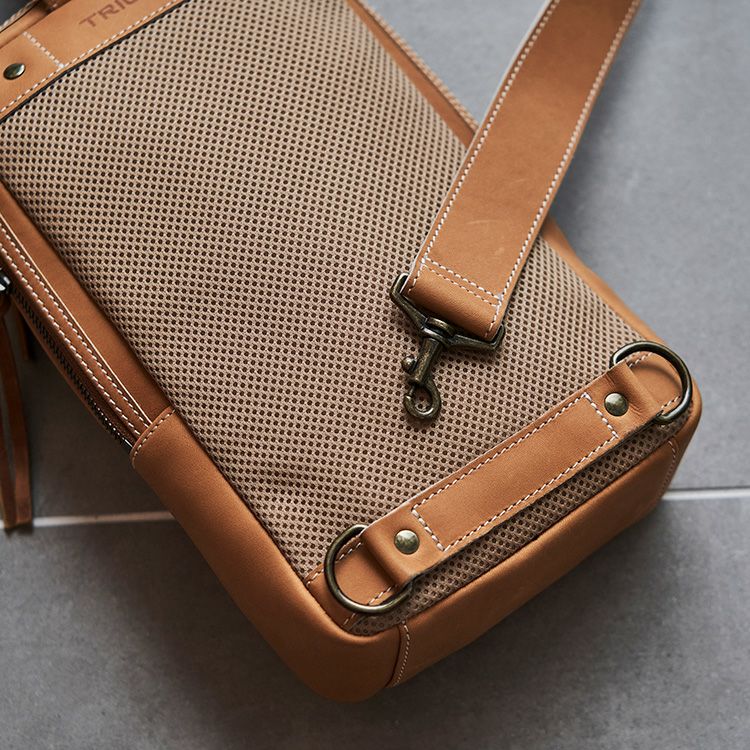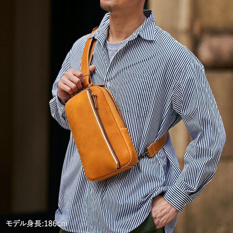 プロ野球選手の野球グローブにも使われる最高級グラブレザーを贅沢に使用し、そこにグラブ作りの技法を落とし込んだ、トライオンのクラフトマンシップが光るボディバッグ。時間をかけて革を育て、経年変化を楽しんで頂けるアイテムです。シックなBlackと、グラブらしい味わいのTanの2色展開です。