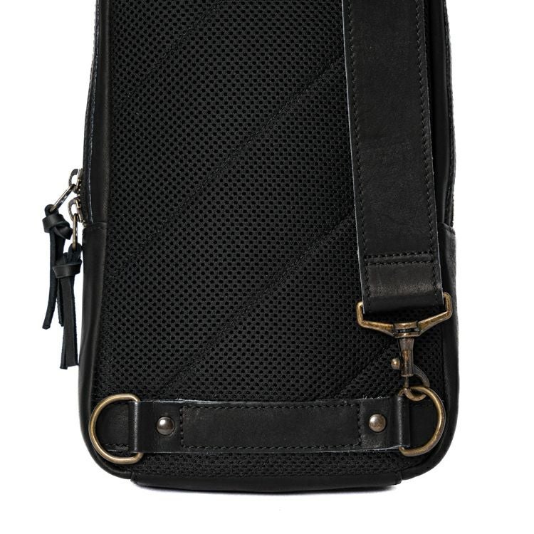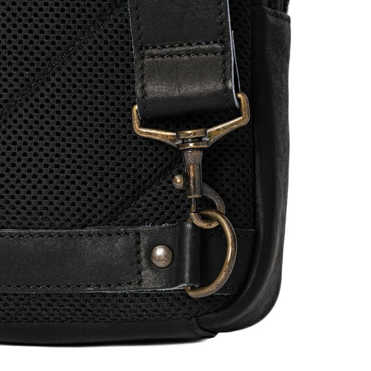 身体に沿う背面は、全面メッシュ素材を採用し、長時間持った時の蒸れを軽減します。また、ショルダーストラップは持ちやすい向きに合わせて背面下部左右につけたD管で付け替え可能。