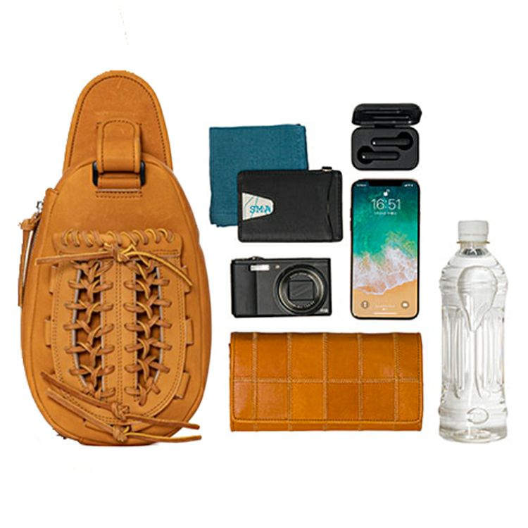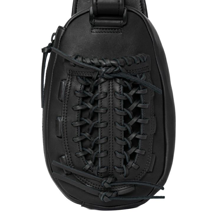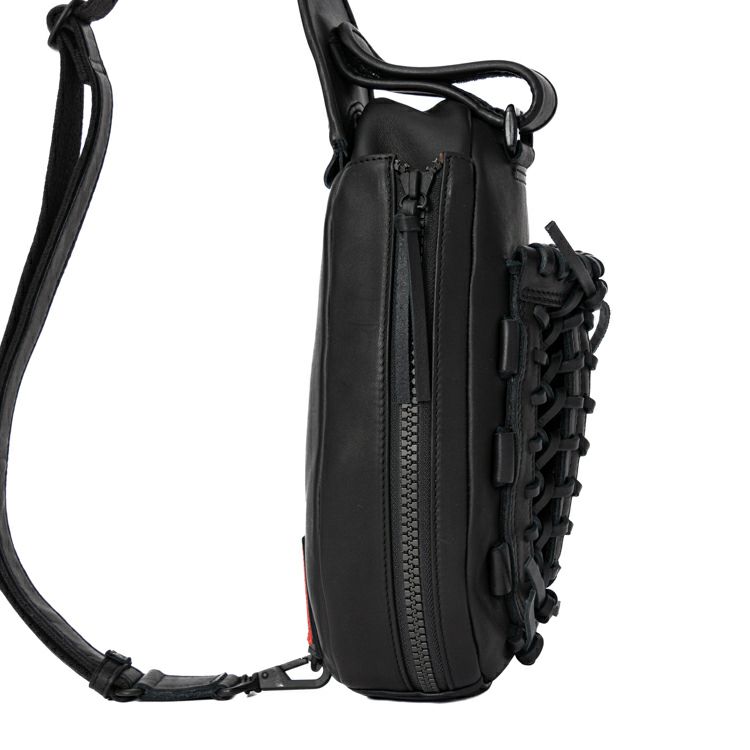 ウェブ部分はポケットになっているので、スマホなどすぐに取り出したい物の収納に便利。グローブの手首ベルトから着想を得たボディ上部のマジックテープベルトを微調整することで、前掛け時の重心を調整し、より身体にフィットすることができます。内装生地は上品なベロア調で、オープンポケット1つ付きです。