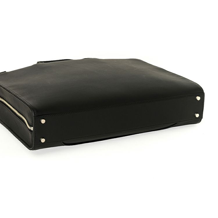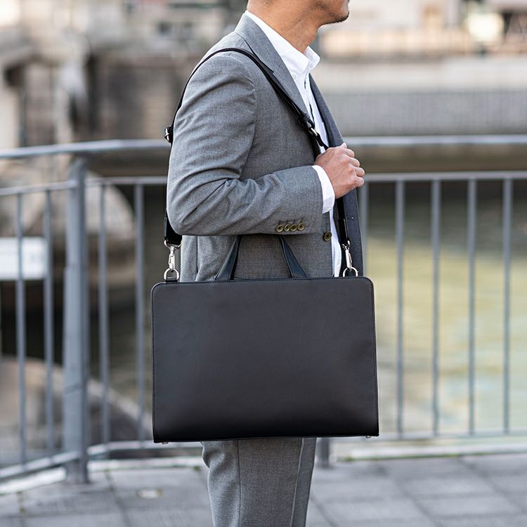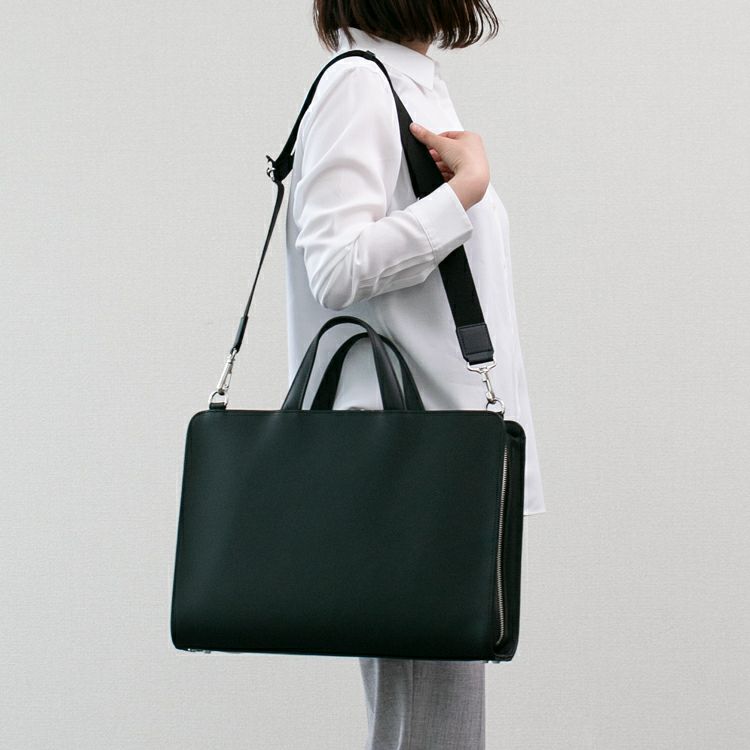 シンプルでミニマル、多機能ながらスマートな印象のビジネスバッグ。最大の特徴は、スーツケースのハンドルに通して固定できるセットアップ機能。手持ちで使用する際にも違和感がないよう、ベルトに見えないようなデザインと持つ人のスタイルを引き立てる上質なレザーにこだわりました。女性でも持ちやすいデザインです。