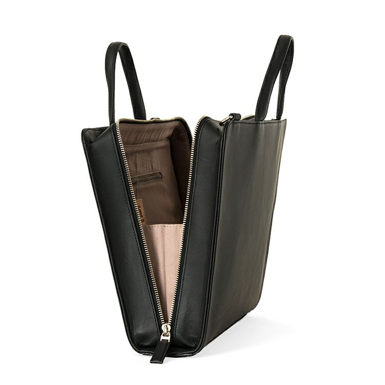 内部はA4書類も入る仕切りポケット、オープンポケット2つ、ジッパーポケット付きで小物類も整理しやすいつくり。
