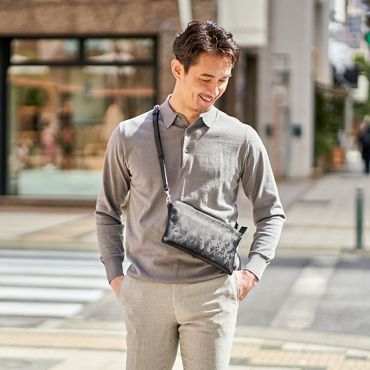 どんなシーンにもスッと馴染むミニマルなデザインと、上質な本革で大人の品も演出するショルダーバッグ。シボ革に光の角度でカモフラージュ柄が浮き出る型押しを施した限定モデルです。Black、Whiteに加えて新たにNavyも登場。どんなシーンにもスッと馴染み、持つ人のスタイルを引き立てるスマートなデザインが魅力。