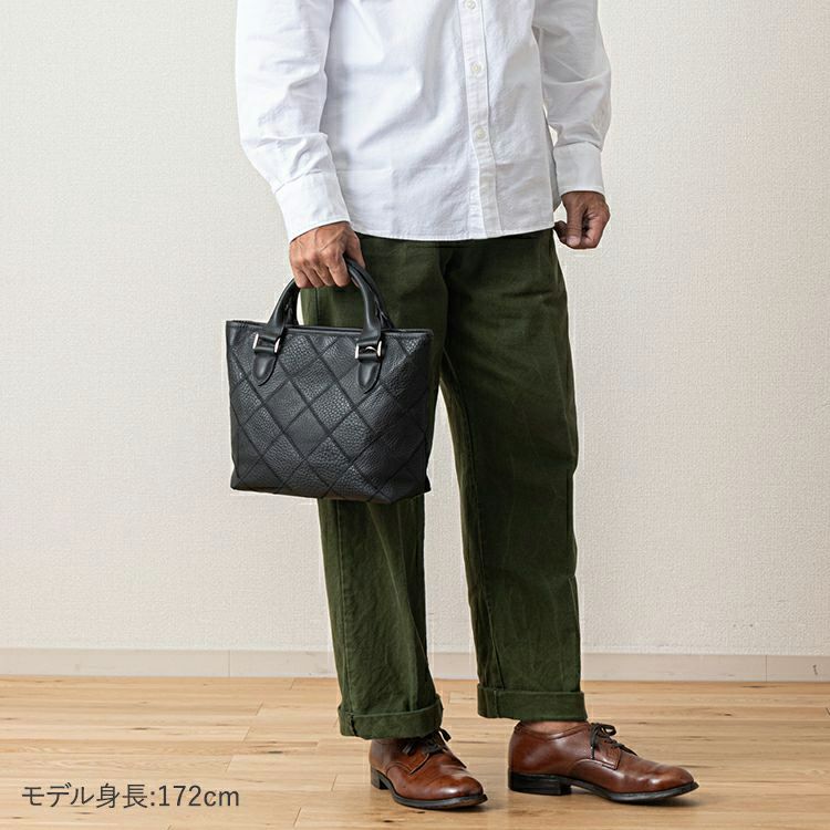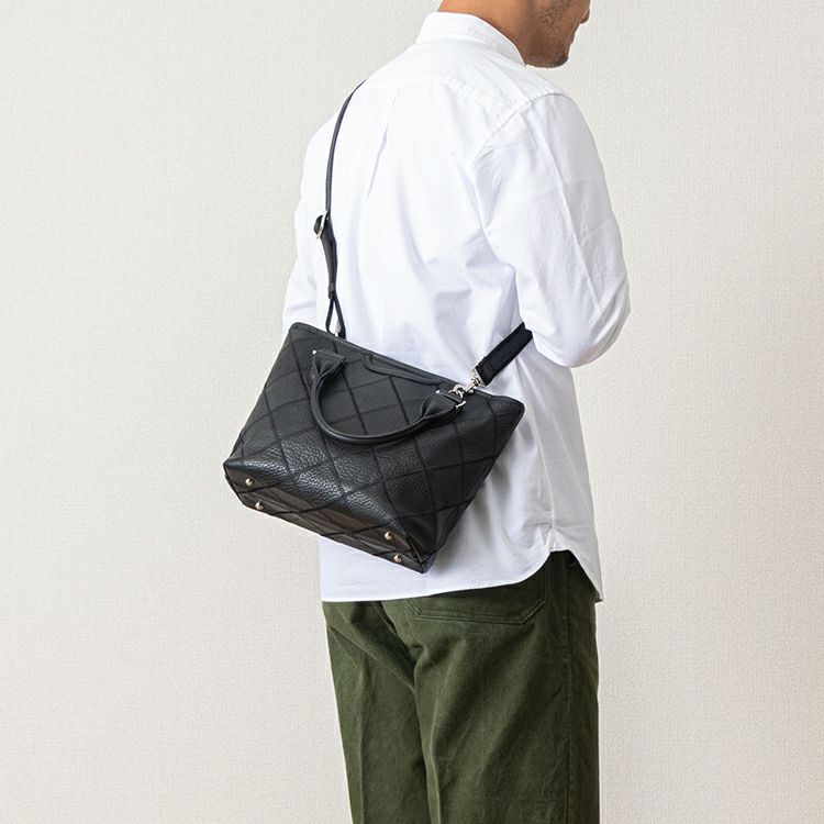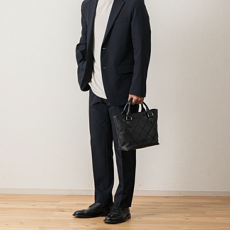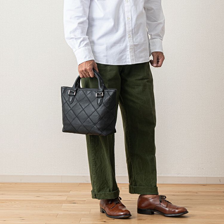 ボディ本体は肉厚で柔らかなタンブルレザーを使用。持つ人の手や身体に馴染みやすく、傷が入っても目立ちにくいのでオン・オフ気負わず毎日使えます。正方形パネルが斜めに並んだ配列できちんと感もある品の良い印象に。