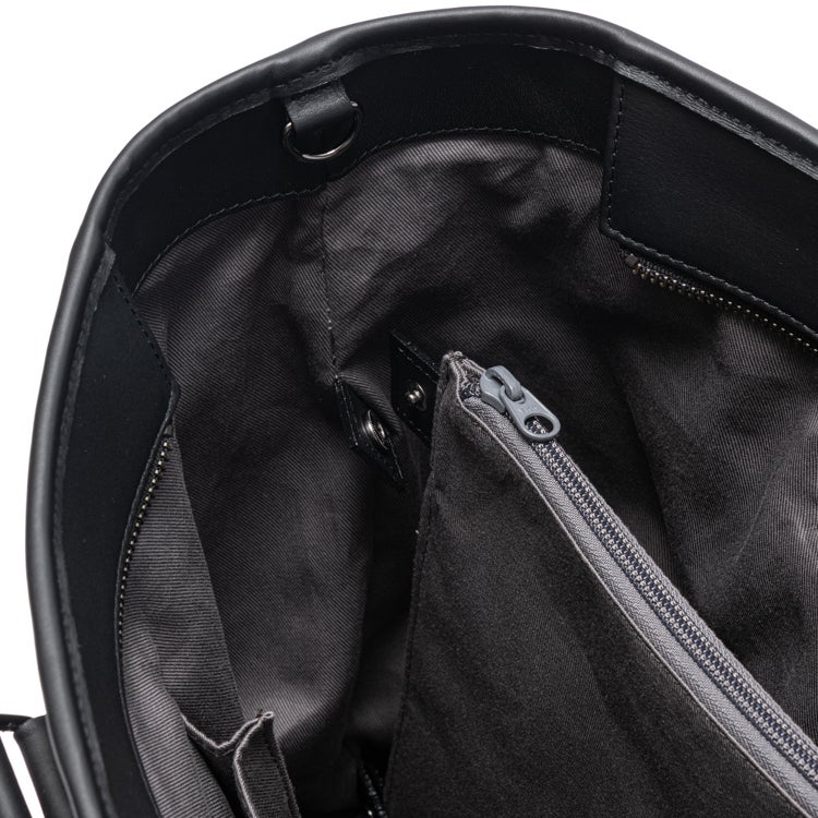 背面上部には定期やスマホに便利な外ポケットを配置。内部は取り外し可能な仕切りポケット付きの3室構造。さらにオープンポケット×2、ジッパーポケット×1を備え、小物の整理もしやすい設計です。