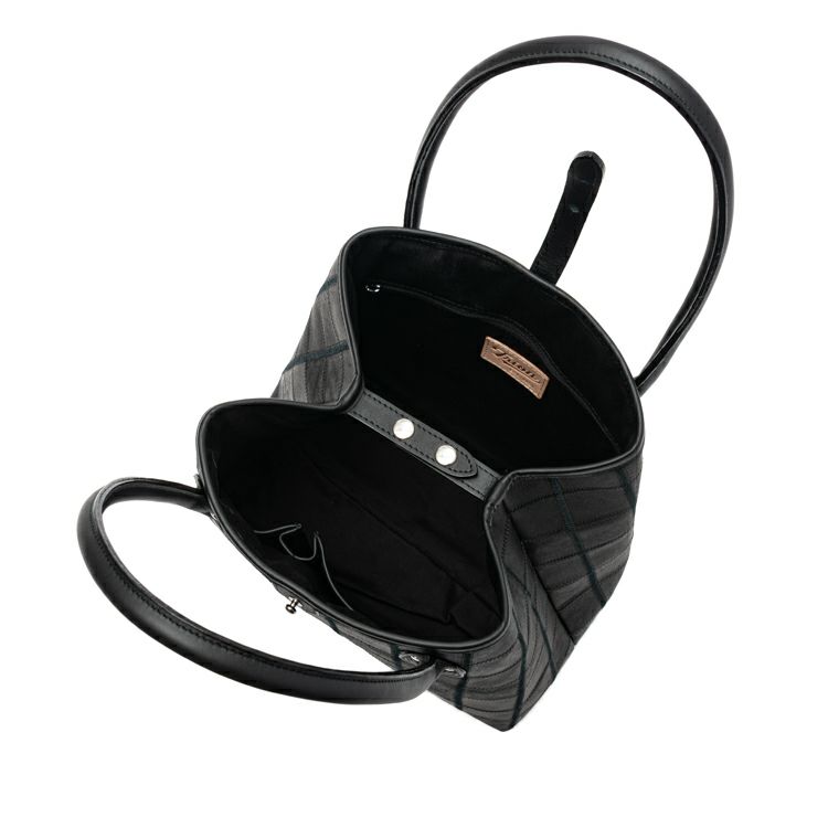 開口部は、クラシカルなギボシ金具で留める仕様。荷物の飛び出しを防ぎながら、アクセントとしても上品な存在感を添えます。