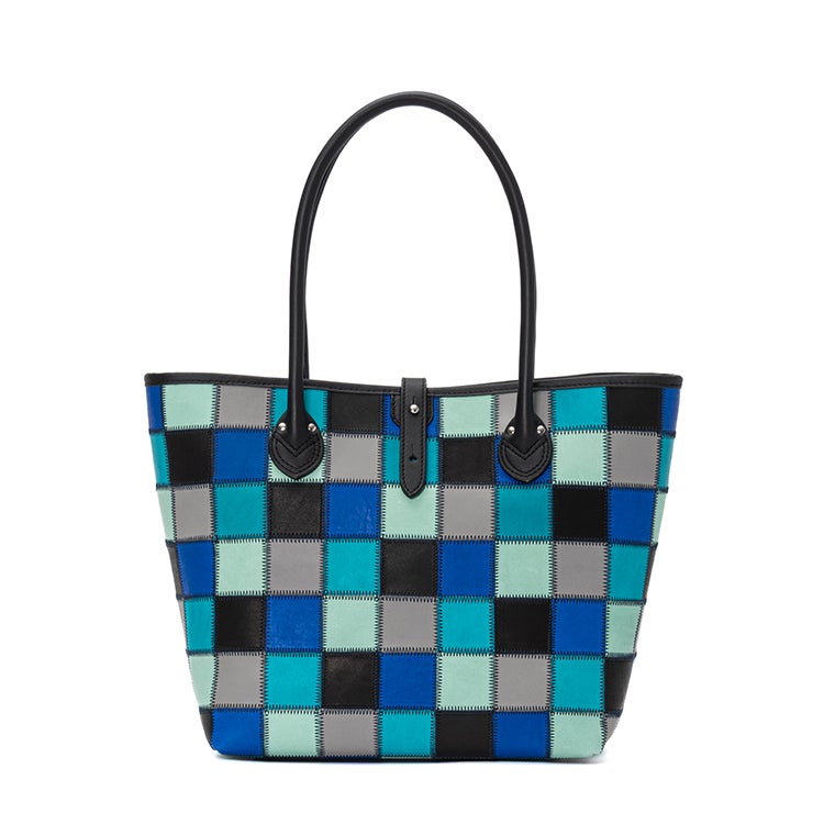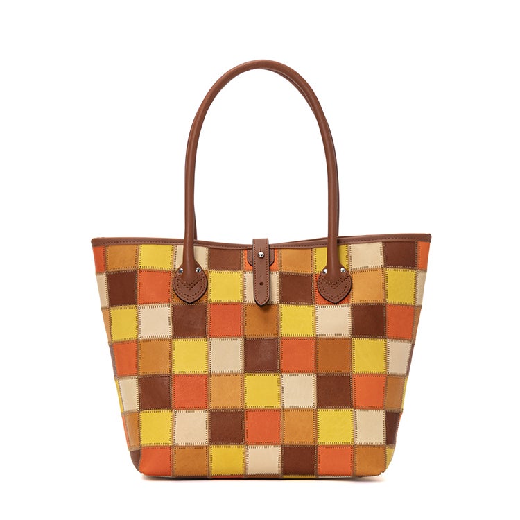複数のレザーを組み合わせた配色が、持つ人の装いにさりげない個性を添えるミディアムトート。ジャストサイズを探していた方におすすめの普段使いしやすい大きさです。