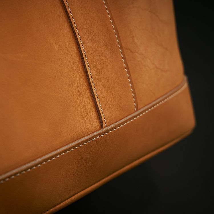 グラブの指部分に用いられる「ハミダシ」を、サイドのマチに応用。グローブでハミダシをつけることで強度が増し、指部分を支える背骨のような役割に。バッグのサイドにハミダシをつけることでピンと立ち上がり、型崩れしにくい丈夫な作りに。